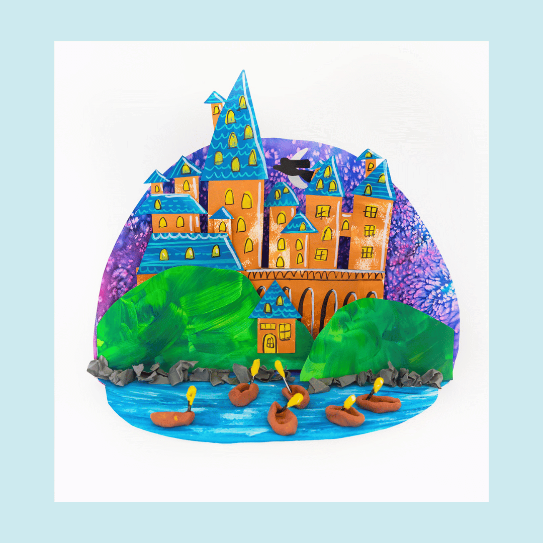 Create a three-dimensional wizard castle diorama by folding and assembling painted paper. Extra details like clay boats and a flying wizard help bring the scene to life.