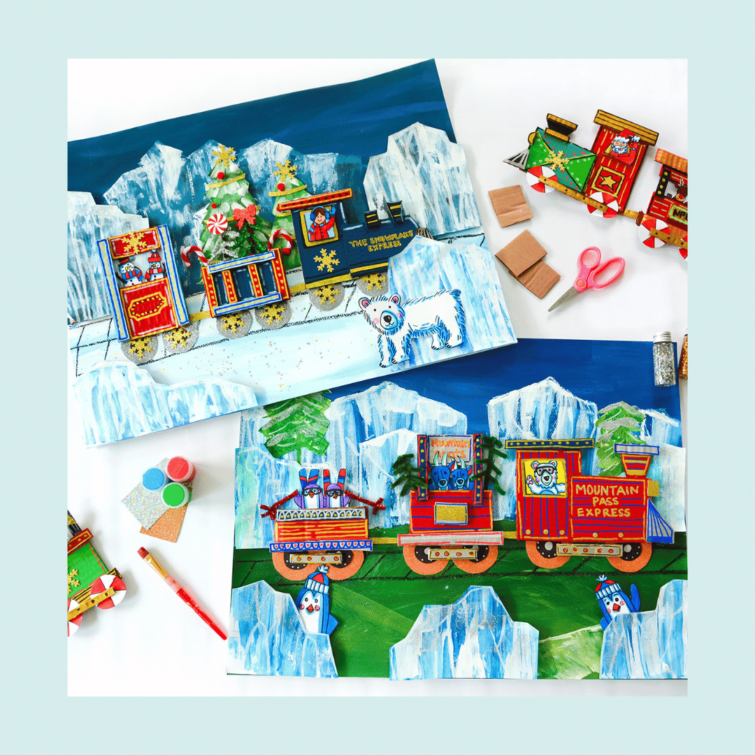 All aboard for an icy-cool adventure! Artists will build a 3D cardboard train chugging through scraped-paint mountains and shimmering icebergs, creating a scene that is full of winter magic. Artists can choose between a Polar Express–style winter wonderland or follow a charming vintage railway route.